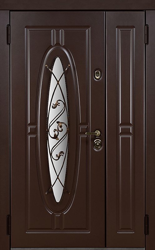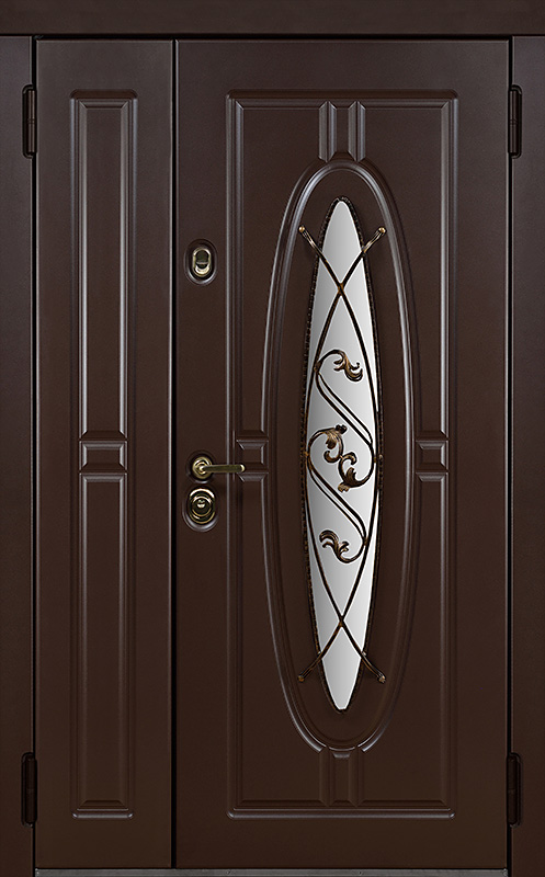 Двойная уличная дверь с овальным стеклом и художественной ковкой №14 — это уникальное сочетание функциональности и эстетики. Панели МДФ с ПВХ-покрытием, используемые как для внешней, так и для внутренней отделки, обладают высокой стойкостью к внешним воздействиям, сохраняя свой внешний вид на долгие годы. Внешний декор в виде художественной ковки придаёт двери особый шарм, подчеркивая её стиль и индивидуальность. Двойная уличная дверь с овальным стеклом и художественной ковкой №14 от производителя: быстрое изготовление и монтаж в Тарусе, индивидуальные размеры, широкий выбор материалов и фурнитуры, официальная гарантия до 10 лет.