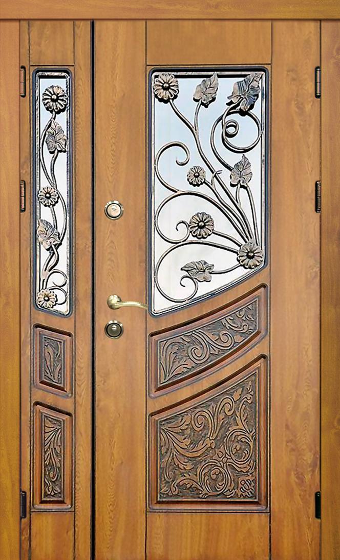 Дверь со стеклопакетом входная №411 создана для тех, кто ценит надежность и одновременно хочет подчеркнуть стиль фасада своего дома. Прочный стальной каркас из профильной трубы с листом металла толщиной 2 мм и системой ребер жесткости гарантирует долговечность и защиту от внешних воздействий. Панели из натурального дерева с обеих сторон придают полотну благородный облик, устойчивый к царапинам и погодным перепадам, сохраняя первоначальный вид долгие годы. Стеклопакет не только украшает дверь, но и наполняет прихожую естественным светом, создавая уют и ощущение открытости. Два контура уплотнителей предотвращают сквозняки и влагу, а встроенные блокираторы усиливают защитные функции. Такая модель удачно совмещает декоративность и практичность, делая парадный вход в коттедж или частный дом одновременно безопасным и выразительным. Дверь со стеклопакетом входная №411 от производителя: быстрое изготовление и монтаж в Тарусе, индивидуальные размеры, широкий выбор материалов и фурнитуры, официальная гарантия до 10 лет.